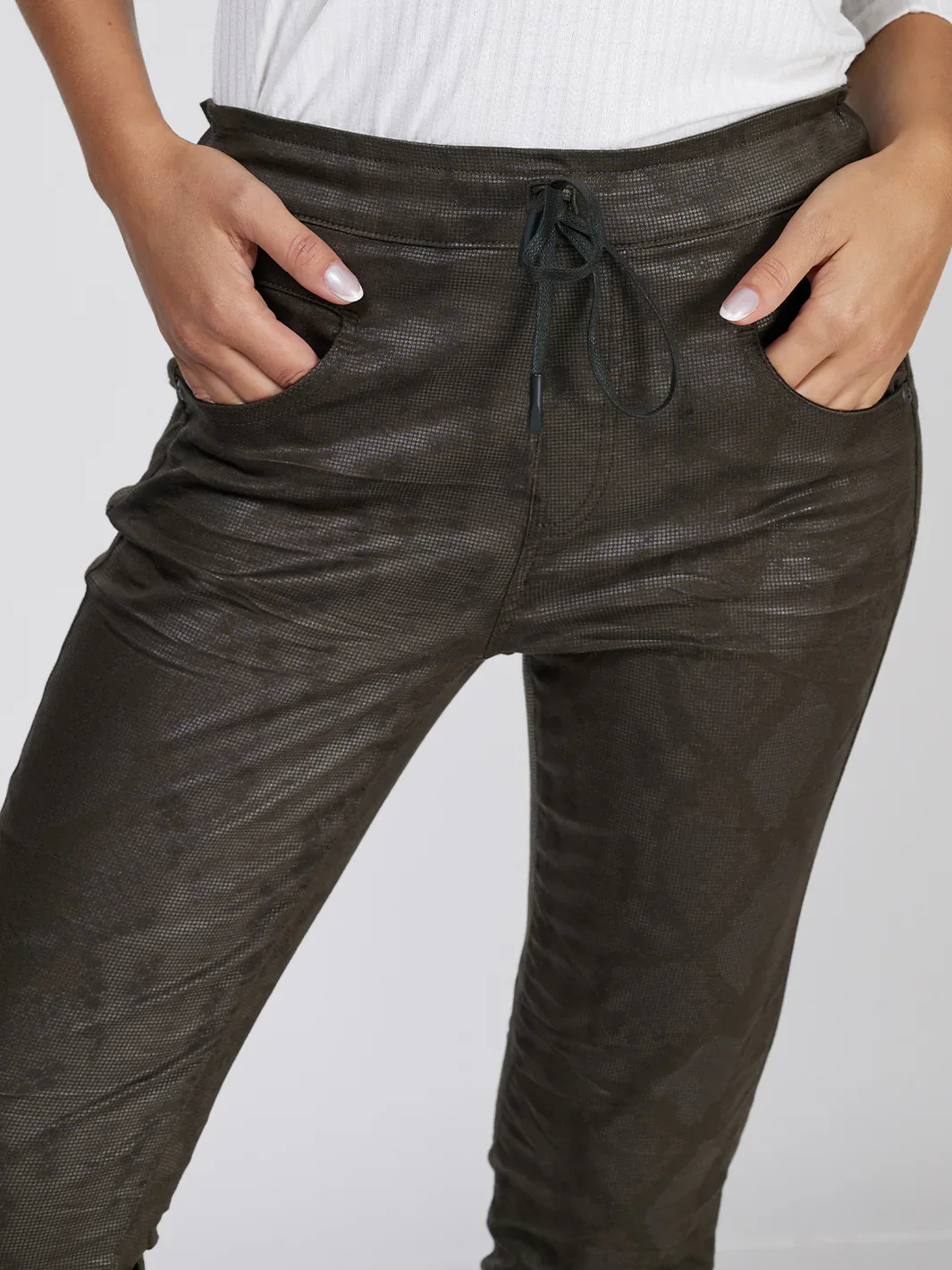 Urban Sophistication in the Metal Black Peyton Pant. These pants are so versatile, boasting a slim boyfriend fit that tapers towards the ankle. With a flat elastic waistband, tie waist and super soft & stretchy fabric, your comfort is ensured. Perfect for casual, dressing up or traveling in style.