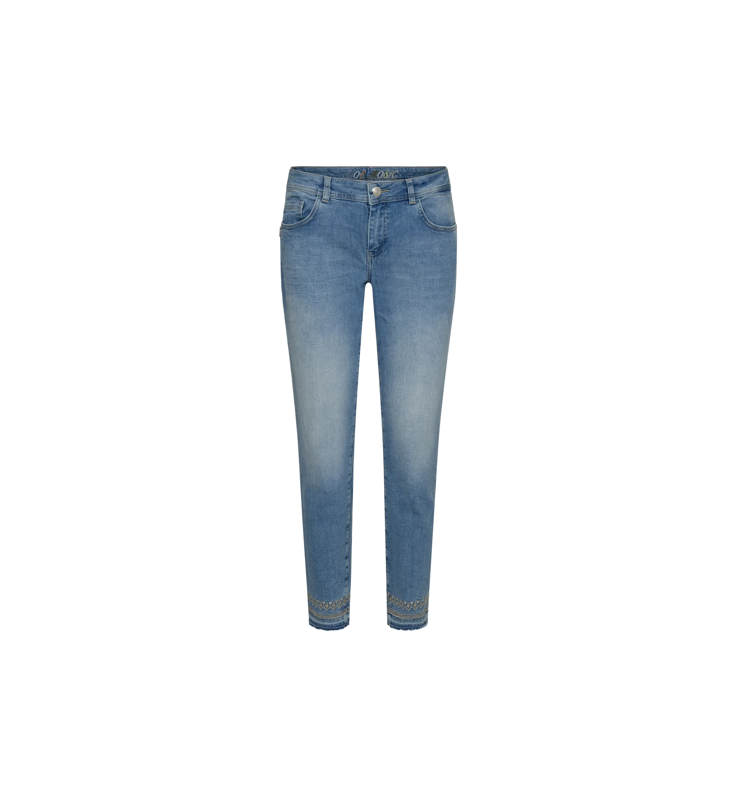 Mos Mosh jeans designed with a slim fit, low rise, and ankle length, these jeans are crafted from comfortable cotton with stretch, perfect for all-day wear. The jeans feature subtle destroyed details and a raw hem decorated with stitching and lurex.